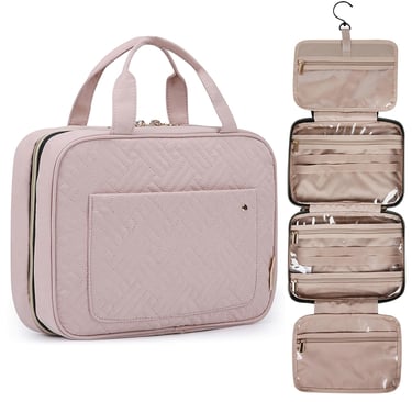 A structured cosmetic bag keeps personal care products organized and easily accessible when traveling. Check it on Amazon